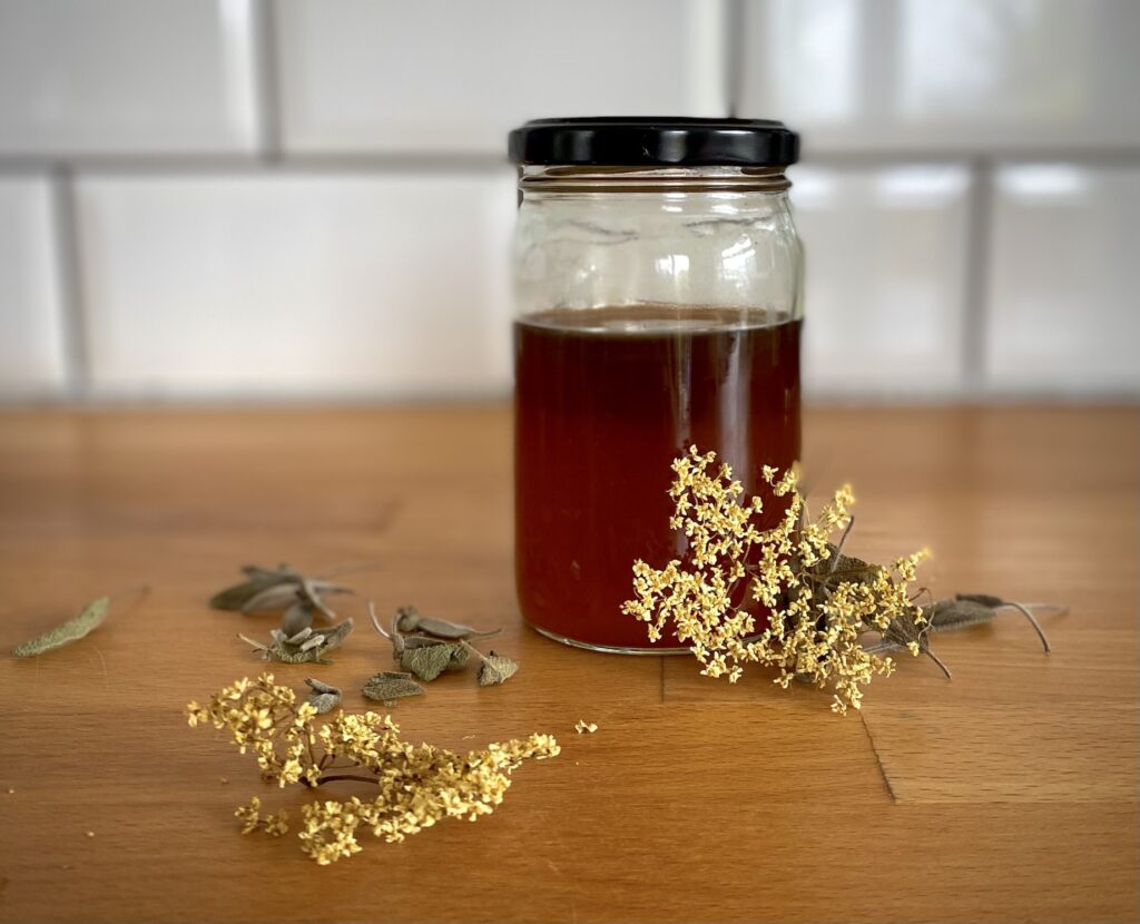 Sein volles Potenzial entfaltet das Oxymel allerdings erst, wenn Heilkräuter dazukommen. Der Nachteil: Es braucht etwas Geduld. Die Mischung sollte zwei bis vier Wochen ziehen, bevor sie einsatzbereit ist. Deshalb bereite ich unser Oxymel schon im Sommer vor – dann, wenn die Kräuter frisch, duftend und voller Kraft sind.