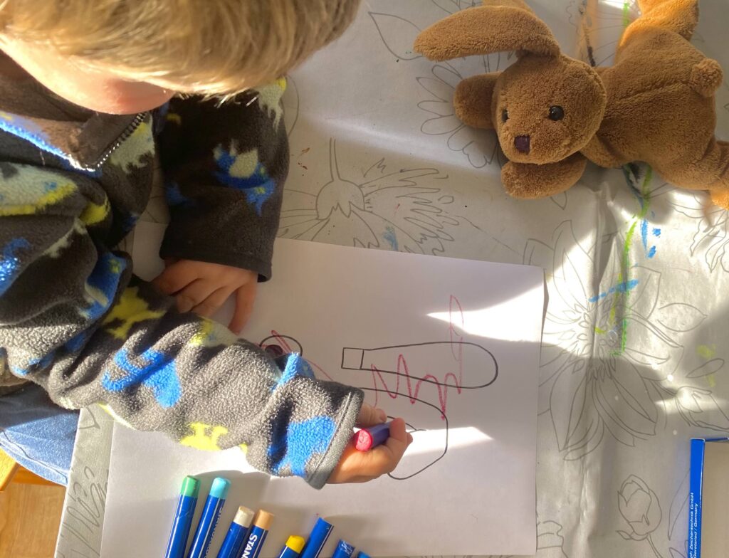 Währenddessen kann dein Kind bereits die Vorlage ausmalen. Damit die Farben besonders schön leuchten, haben wir Wachsmalstifte verwendet. Buntstifte oder Wasserfarben funktionieren aber genauso gut.