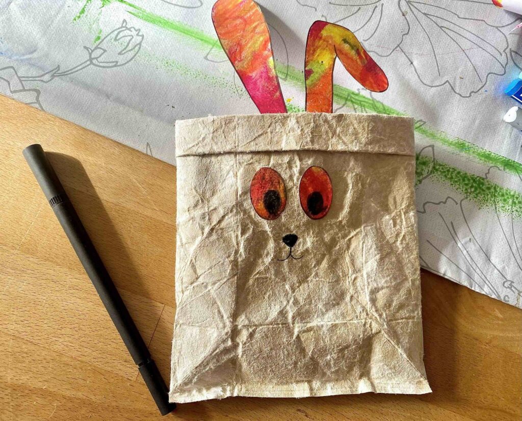 Die ausgemalte Vorlage wird anschließend ausgeschnitten. Danach kannst du die Augen mit einem Klebestift befestigen. Die Ohren hat mein Sohn erst mit Klebestift an die Innenseite geklebt. Da ich mir aber unsicher war, wie gut der Kleber auf dem Wachsmalstift halten wird habe ich die Ohren zusätzlich mit einem Klebestreifen fixiert. So bleiben die Ohren auch etwas stabiler stehen.