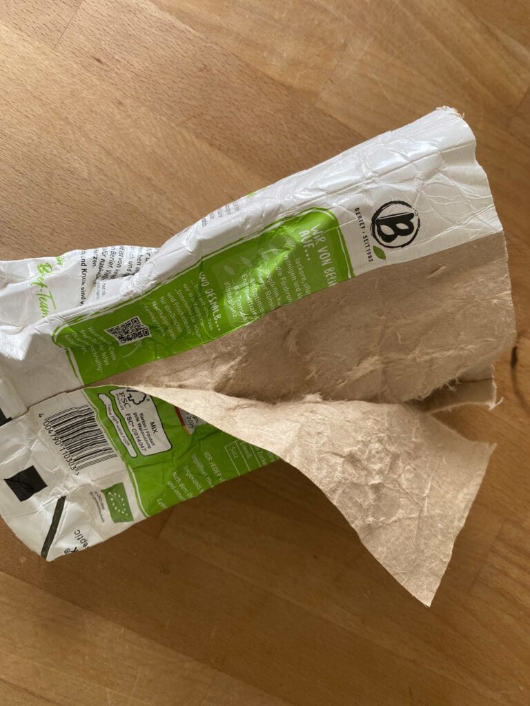 Wenn die äußere Schicht vollständig abgezogen ist, kannst du die obere Kante einmal großzügig nach innen falten. Anschließend faltest du einen schmaleren Streifen wieder nach außen. So entsteht ein sauberer Abschluss und die silberne Innenseite bleibt von außen unsichtbar.