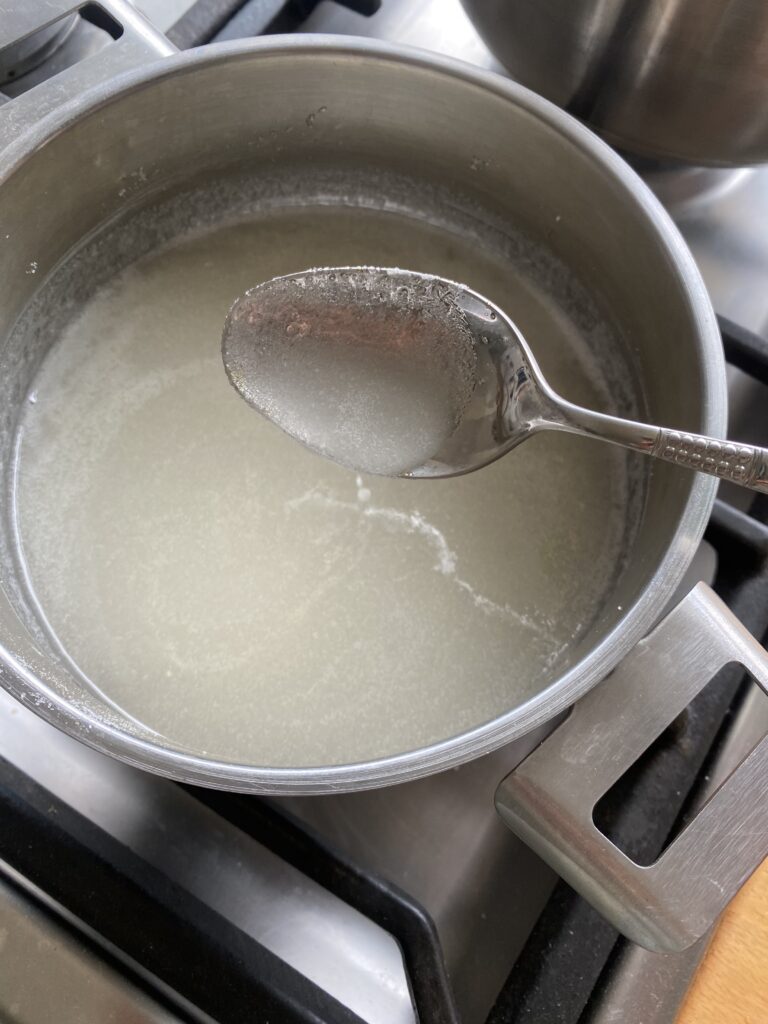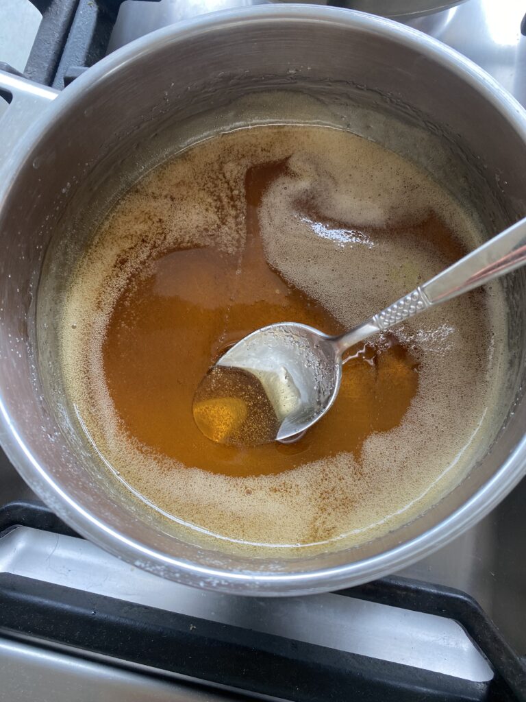 Die drei Zutaten habe ich zusammen in einen kleinen Topf gegeben und bei niedriger Hitze erwärmt. Du solltest dabei wirklich sehr regelmäßig umrühren.