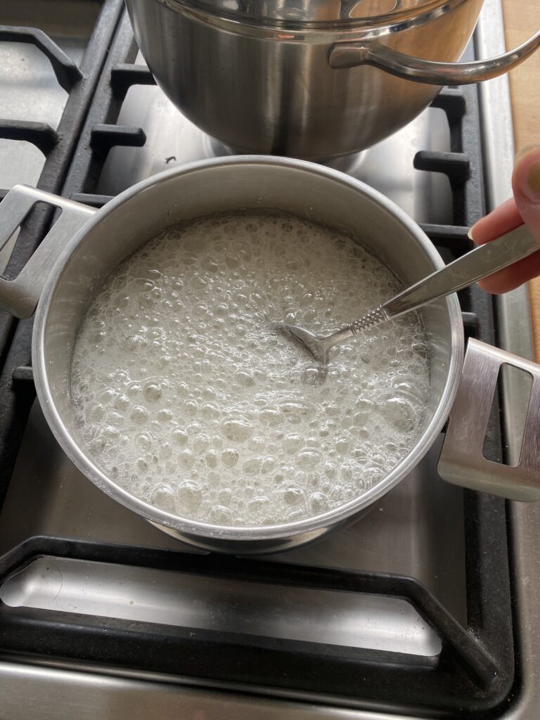 Wenn die Masse hochkocht, nimmst du den Topf von der Platte und wartest, bis die Bläschen verschwunden sind. Dann kannst du den Topf wieder auf den Herd stellen und die Zuckermischung unter Rühren erneut aufkochen lassen.