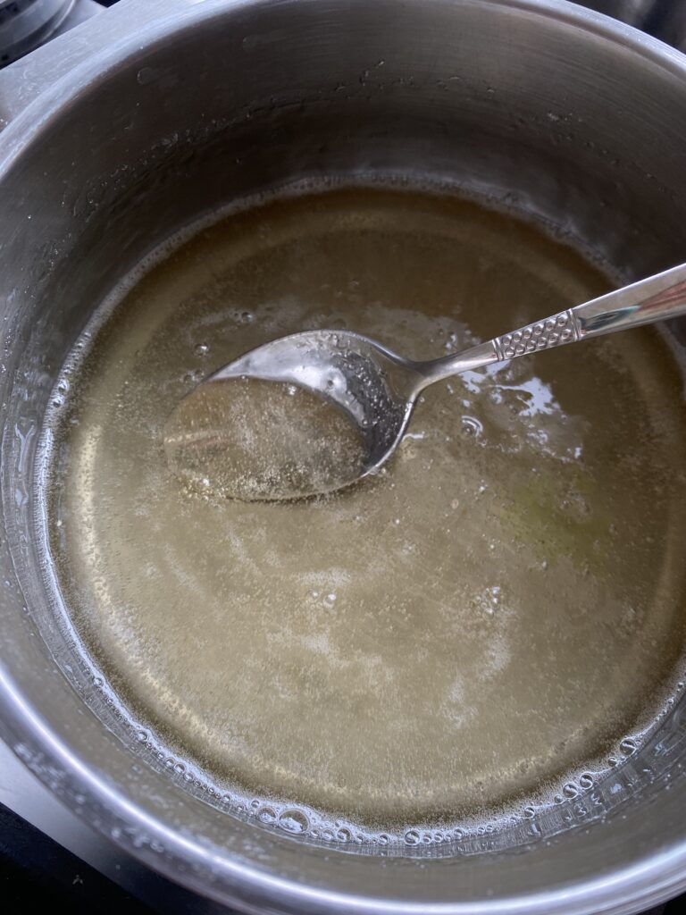 Es dauert nicht lange, bis sich der Zucker löst und flüssig wird. Mit der Zeit bilden sich dann immer mehr Bläschen und der Topf füllt sich.