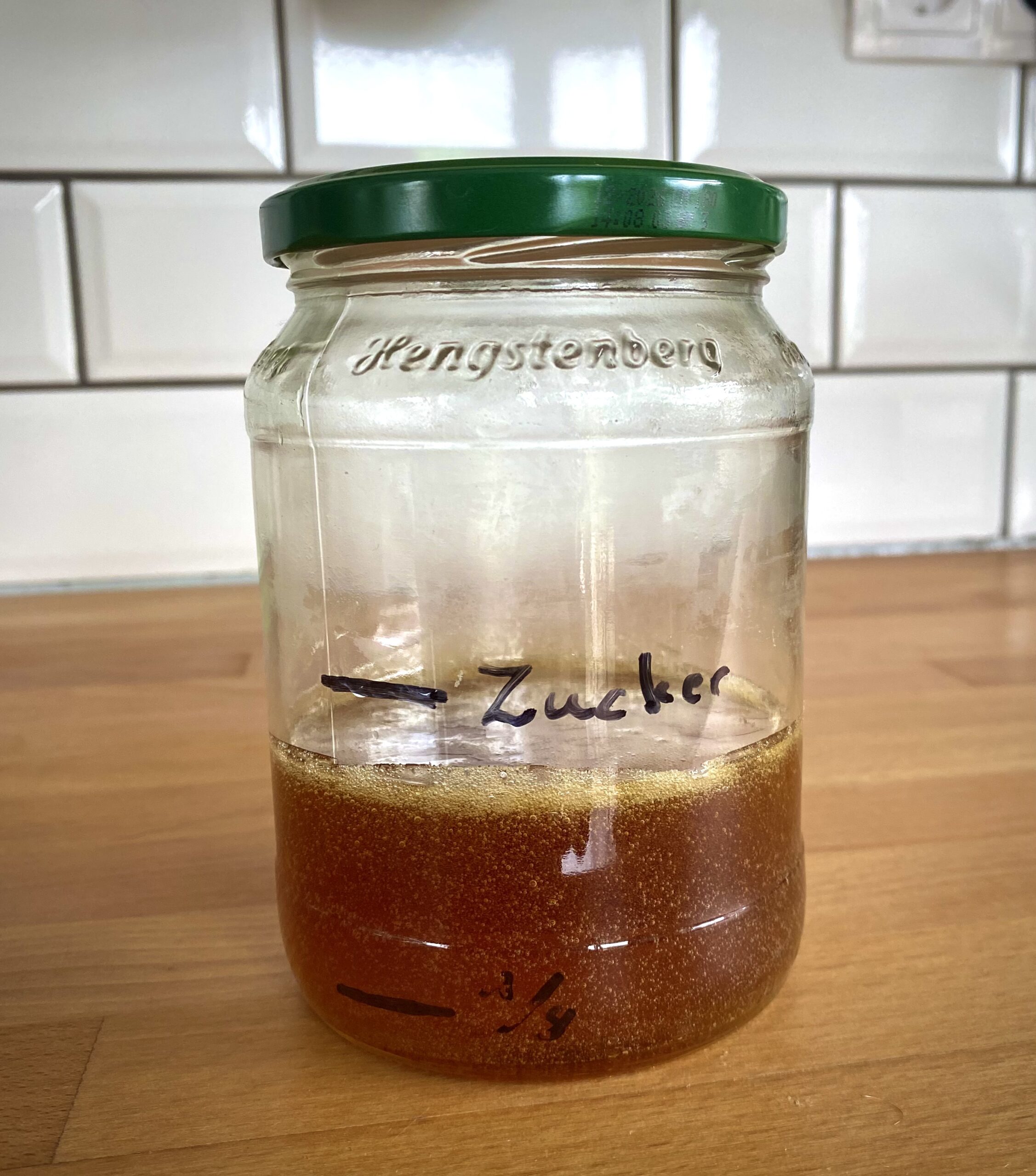 Sobald sich die klare Flüssigkeit leicht einfärbt, wie auf dem ersten Bild zu sehen ist, solltest du gut aufpassen und regelmäßig die Farbe prüfen.